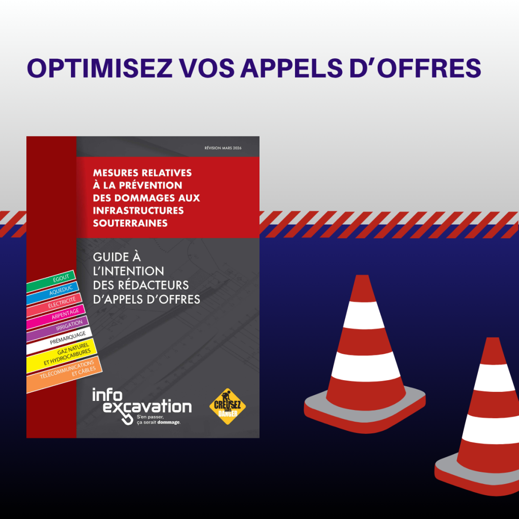 Afin de soutenir les organisations municipales, Info-Excavation met à leur disposition le Guide des clauses d’appels d’offres et son outil Excel complémentaire. Mis à jour en mars 2026, ils proposent des recommandations et des formulations prêtes à l’emploi pour intégrer ces bonnes pratiques en prévention des dommages dans les appels d’offres des projets comprenant de l’excavation.