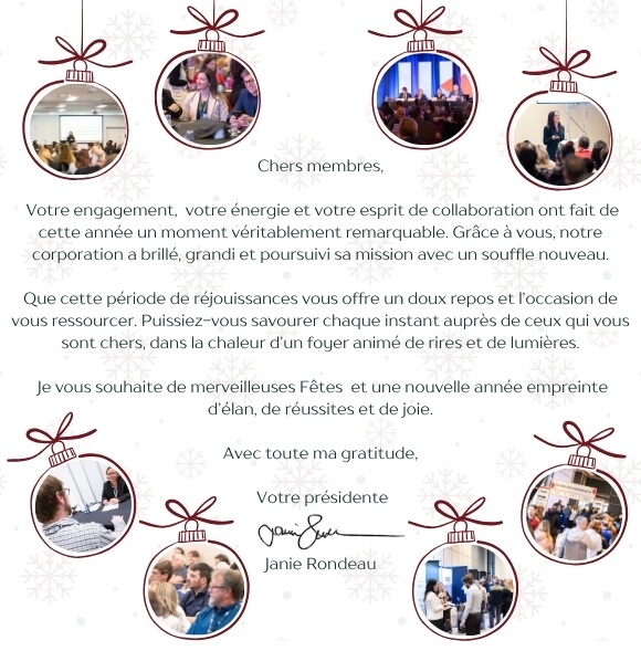 Les inscriptions aux formations 2026 débuteront dans la semaine du 15 décembre! Nous travaillons en collaboration avec la Fédération québécoise des municipalités (FQM) qui a mis sur pied un tout nouveau portail d’inscription à la fois moderne et convivial. Vous recevrez bientôt un courriel avec tous les renseignements au sujet des formations, la façon de se connecter, le tarif préférentiel et plus encore! Entre-temps, prenez connaissance des dates des différentes sessions et formations qui répondent à votre parcours pour les mettre à votre agenda et prévoir le budget. Au plaisir de vous compter parmi nous!